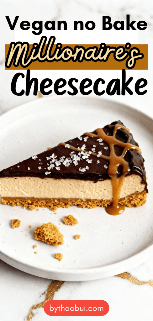 This layered vegan cheesecake brings together a cookie base, creamy filling, and a caramel layer that feels rich without being heavy. The textures all work well together, with the crunch of the crust balancing the smooth middle and sticky top. If you like the classic flavors of a millionaire’s shortbread, this no-bake version offers a fresh way to enjoy them in cheesecake form.