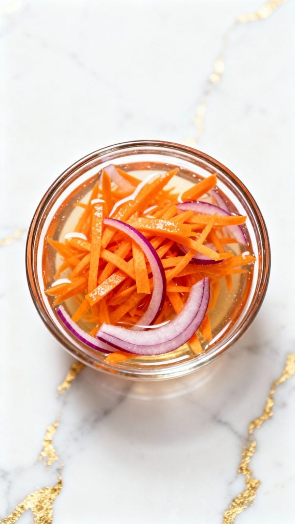 In a bowl, mix 1/2 cup shredded carrot, 1/4 cup thinly sliced red onion, 1 tbsp rice vinegar, 1 tbsp sugar, and 1/4 tsp salt. Stir and let sit for at least 20 minutes.