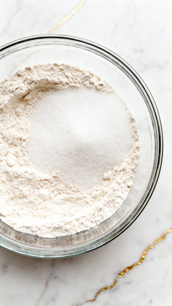 In a medium bowl, whisk together 1 cup all-purpose flour, 1/2 cup granulated sugar, 1 tsp baking powder, 1/4 tsp baking soda, and 1/4 tsp salt.