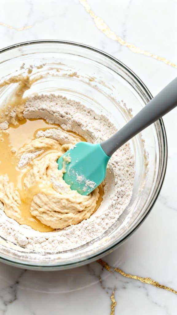 Pour the wet ingredients into the dry and stir just until combined with a spatula. Don’t overmix.