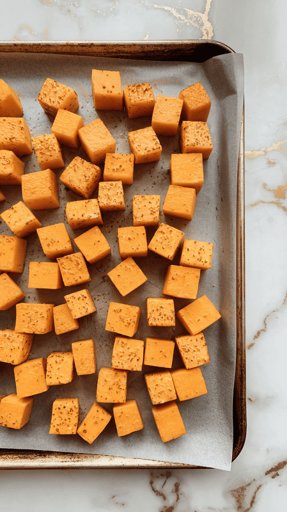 Line a large baking sheet with parchment paper or spray it with cooking spray. Spread the coated squash cubes out in a single layer, making sure there’s space between them.