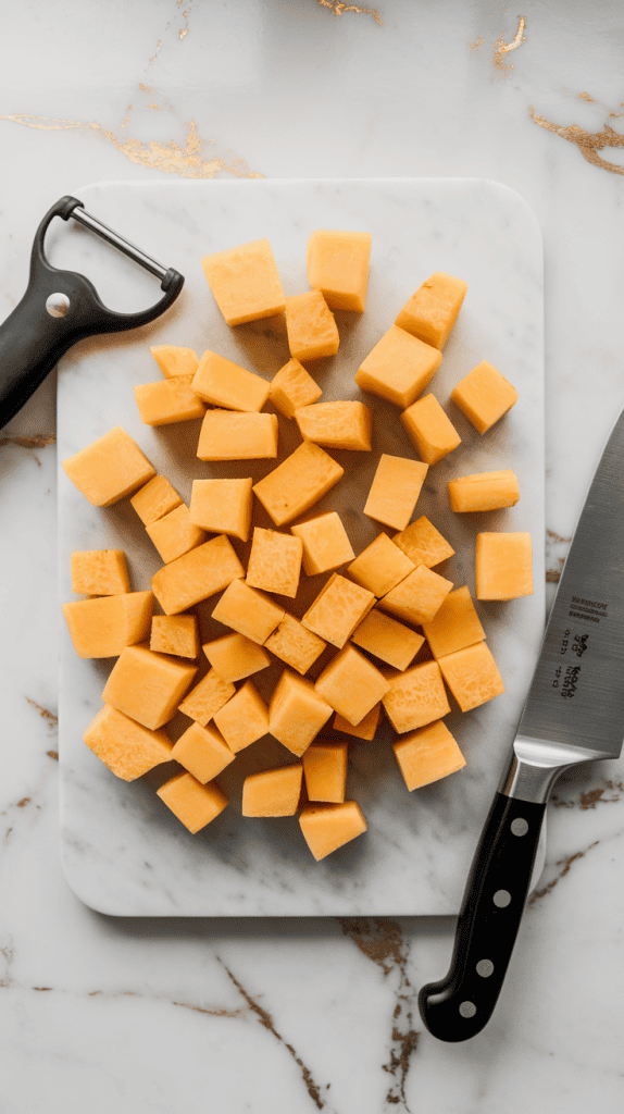 Peel 1 medium butternut squash (about 2.5 lbs) using a vegetable peeler. Cut it in half, scoop out the seeds, then dice it into 1-inch cubes.