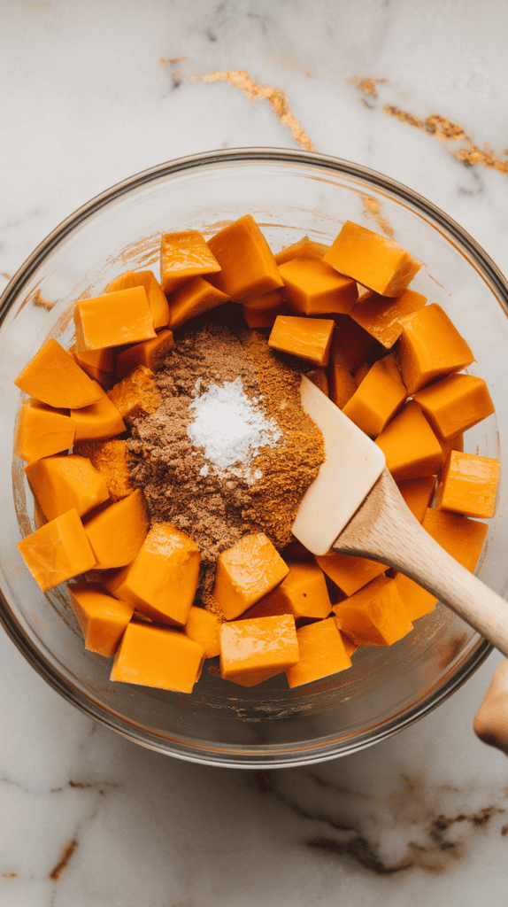 In a large mixing bowl, add the cubed butternut squash, 2 tablespoons melted unsalted butter, 2 tablespoons packed light brown sugar, ½ teaspoon ground cinnamon, and ¼ teaspoon salt. Toss everything together until all the squash is well coated.