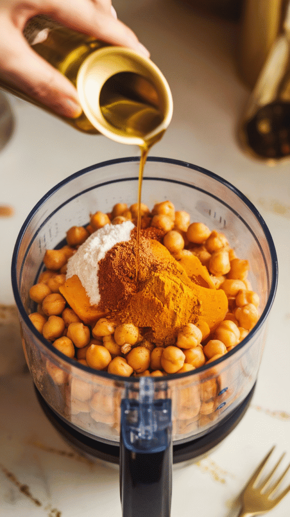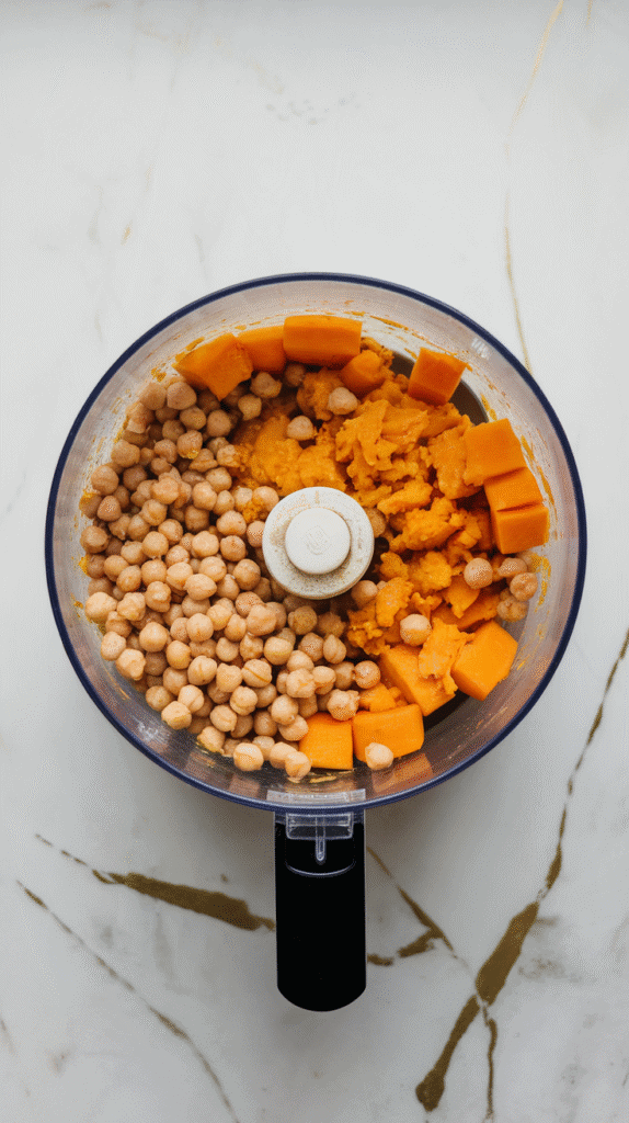 In a food processor, add 1 cup mashed roasted butternut squash and 1 can (15 oz) drained, rinsed chickpeas.
