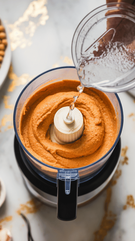 Blend the mixture on high until smooth. Add 2–4 tbsp cold water, one spoonful at a time, until the hummus is creamy and easy to scoop.