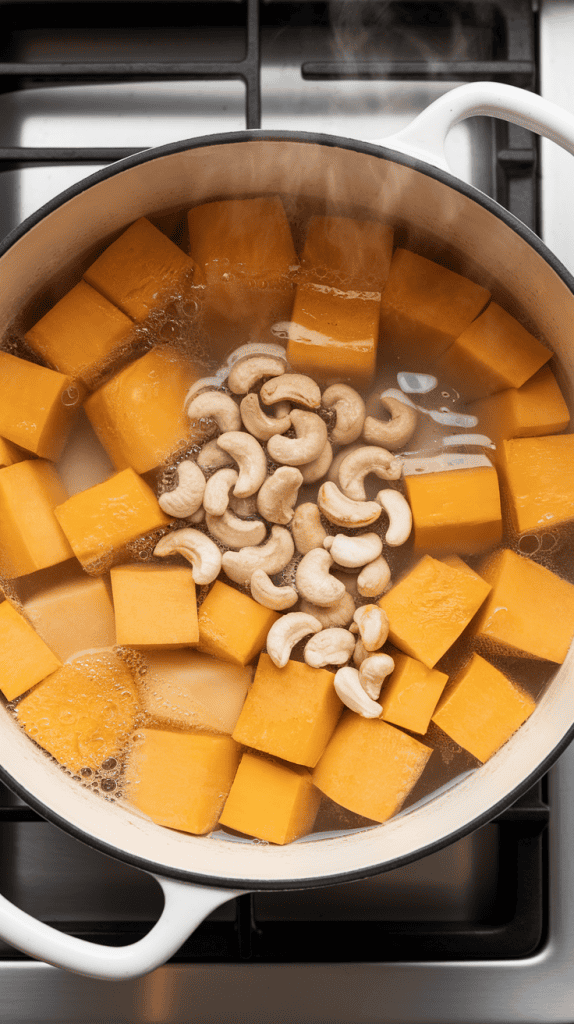 In a medium pot, add 2 cups peeled and cubed butternut squash and 1/2 cup raw cashews. Cover with water and bring to a boil. Cook for 10-12 minutes until squash is fork-tender.