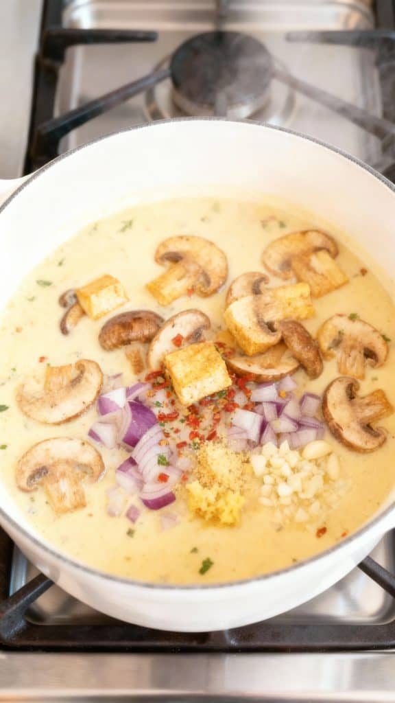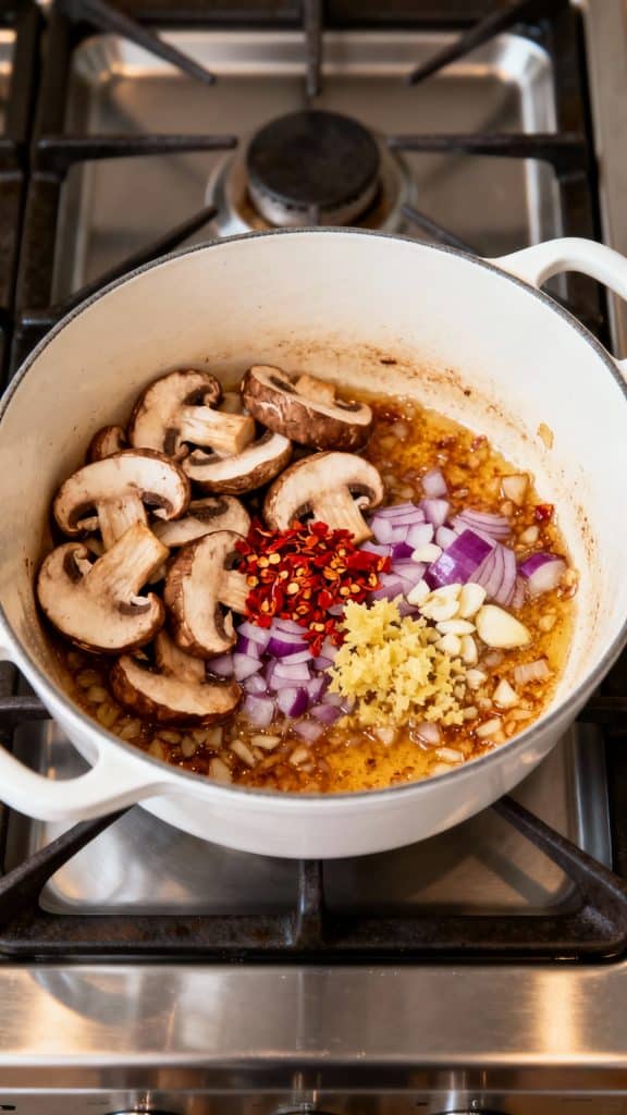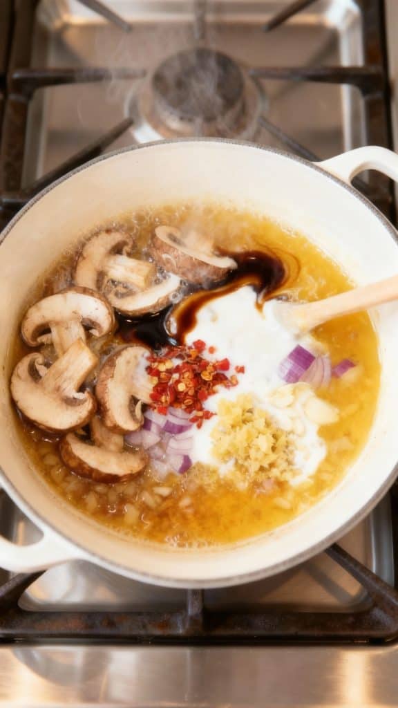 Add 2 cups sliced cremini mushrooms and 1 tsp chili flakes (optional). Cook another 4–5 minutes, stirring occasionally, until mushrooms soften and release their juices.