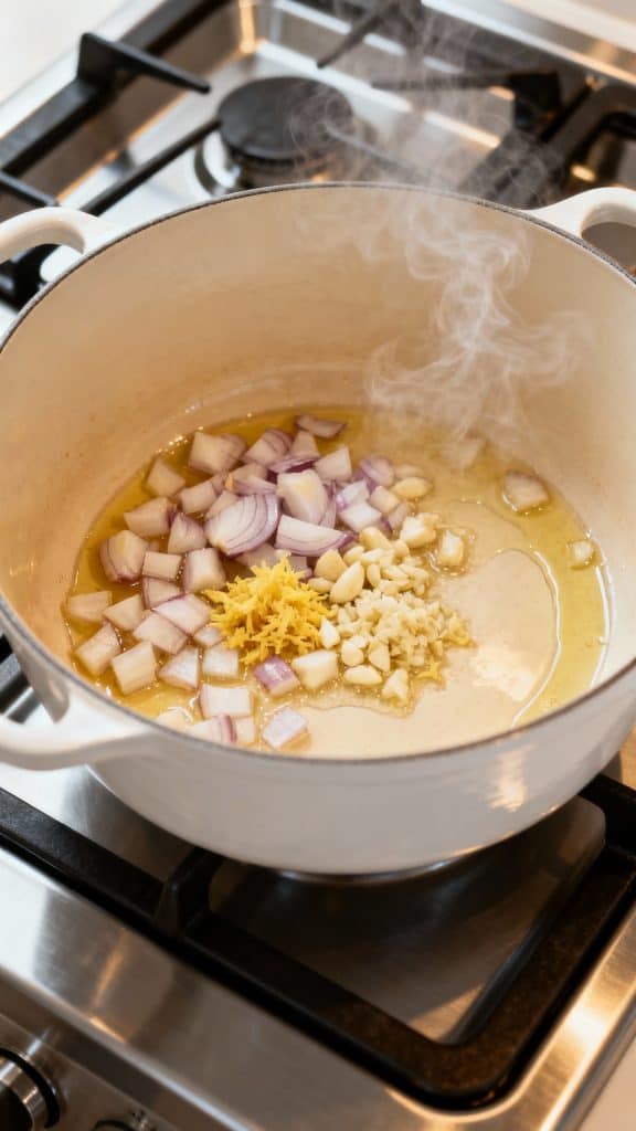 Heat 1 tbsp neutral oil in a soup pot over medium heat. Add 1 diced onion, 3 minced garlic cloves, and 1 tbsp grated ginger. Cook for 2–3 minutes until soft and fragrant.