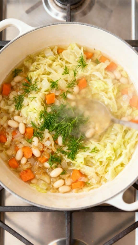 Cabbage breaks down and softens quickly in broth, releasing natural sweetness. White beans add creaminess and protein without dairy or flour. Adding dill and lemon at the end keeps the flavor fresh instead of muddy.