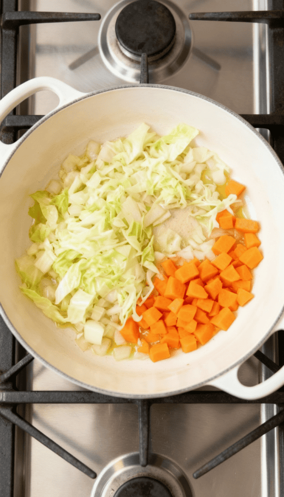 Add 4 cups shredded green cabbage and 1 diced carrot. Stir and cook for about 5 minutes until the cabbage begins to soften.