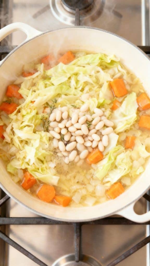 Lower the heat and let the soup simmer uncovered for 15 minutes. Then stir in 1 can of drained and rinsed white beans and let it cook 5 more minutes.
