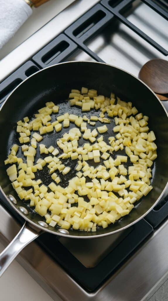 In a small pan over medium heat, heat 1 tbsp olive oil and add 1 medium diced yellow onion and 4 minced garlic cloves. Cook until soft and fragrant, about 3-4 minutes.