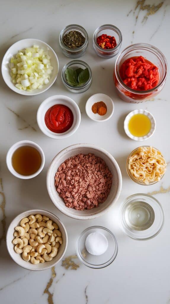 It has all the classic flavors — rich tomato broth, soft noodles, warm Italian herbs, and a dreamy dollop of cashew ricotta on top.