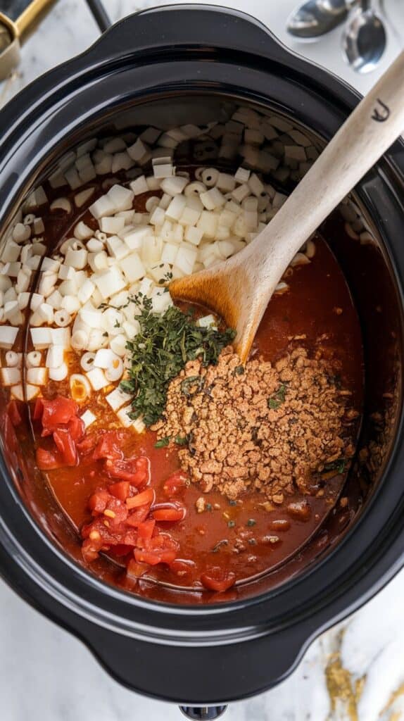 Transfer the cooked onions and garlic to your slow cooker. Add 1 tsp salt, 1 tsp dried oregano, 1 tsp dried basil, ½ tsp crushed red pepper flakes, 1 (6 oz) can tomato paste, 1 (28 oz) can crushed tomatoes, 6 cups vegetable broth, and 1 cup vegan ground crumbles. Stir well.