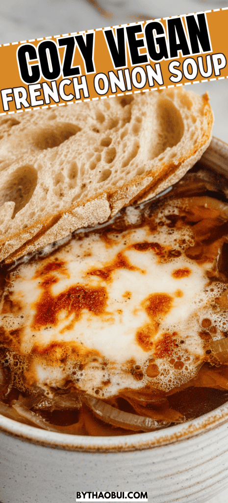 It’s rich, savory, and super comforting. We’re talking deep golden caramelized onions, simmered in a flavorful broth, and topped with crusty bread and melty dairy-free cheese.
