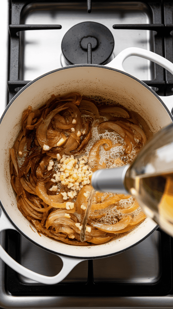 Add 2 cloves of minced garlic to the caramelized onions. Stir and cook for 1 minute. Then pour in ½ cup dry white wine. Scrape the bottom of the pot to release any brown bits. Let it simmer for 2–3 minutes to cook off the alcohol.