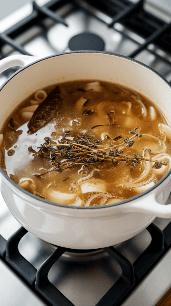 Caramelizing onions breaks down their natural sugars, giving that deep, sweet flavor. Deglazing with wine lifts all the browned bits (a.k.a. flavor bombs) from the pot. Simmering the broth with thyme and soy sauce gives it that rich umami usually found in beef-based versions — without any meat.