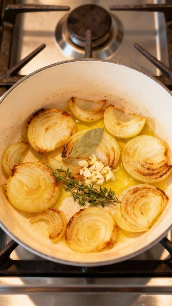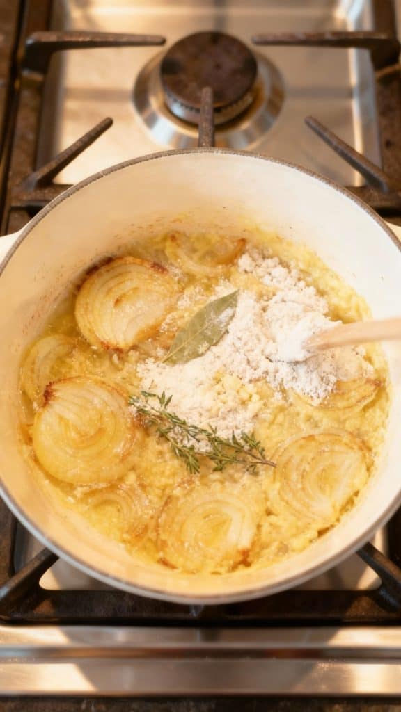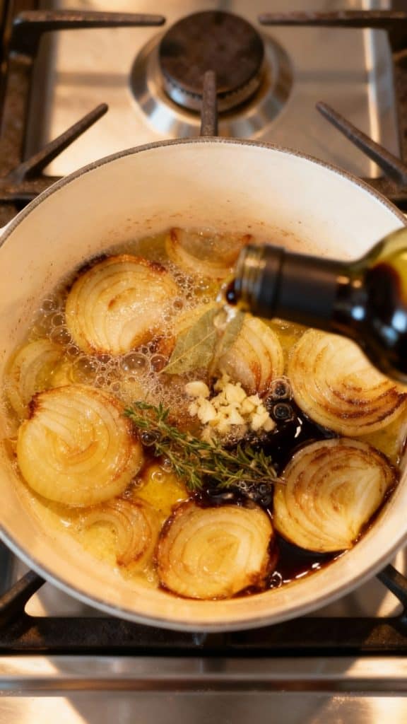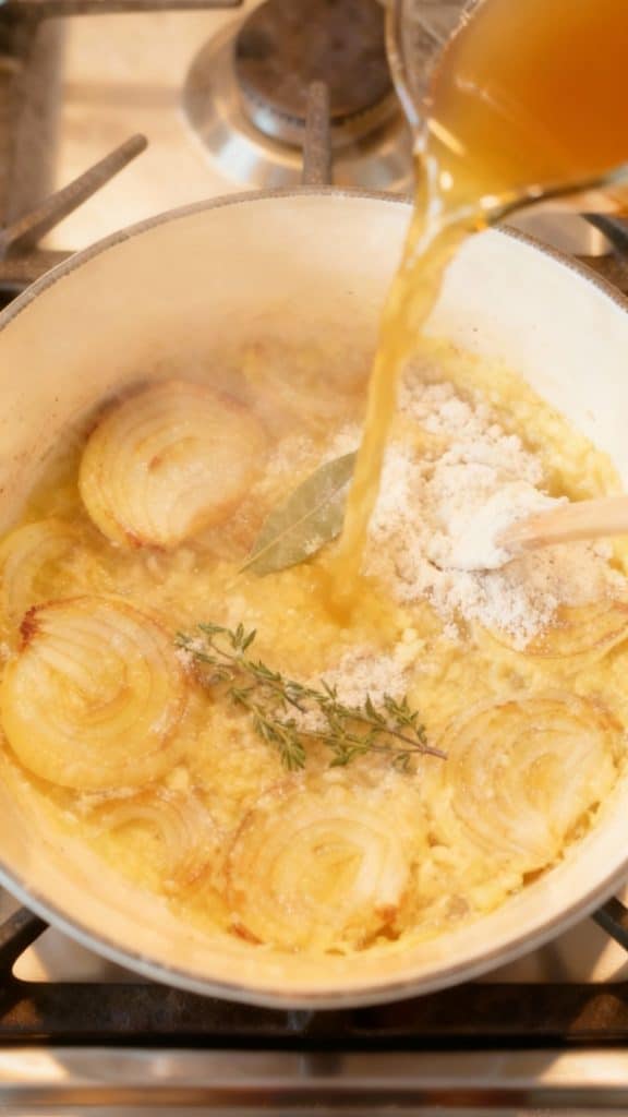 The secret is caramelization. When you slowly cook onions in olive oil, the natural sugars break down and deepen in flavor. Adding a bit of flour thickens the broth slightly, while the wine, vinegar, and herbs layer in acidity and depth. It’s all about balance.