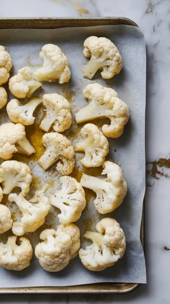 Preheat the oven to 425°F (220°C). Spread 5–6 cups cauliflower florets on a parchment-lined baking sheet. Drizzle with 1 tablespoon olive oil, and sprinkle with a pinch of salt and black pepper. Toss to coat, then roast for 25–30 minutes, flipping halfway, until golden and tender.
