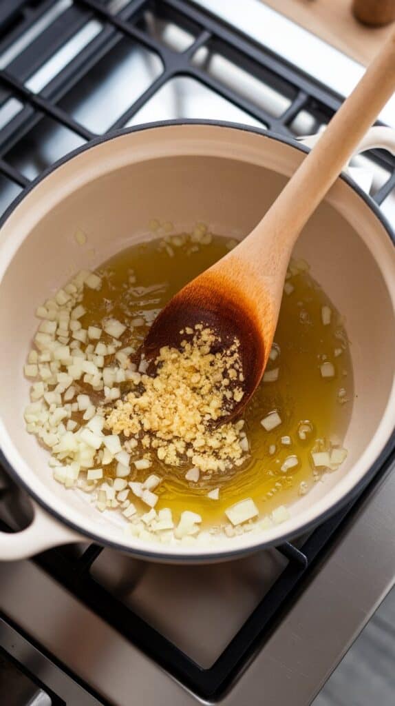 In a large pot, heat 1 tablespoon olive oil over medium heat. Add 1 chopped yellow onion and cook for 4–5 minutes, until soft. Add 2 minced garlic cloves and cook 1 minute more.