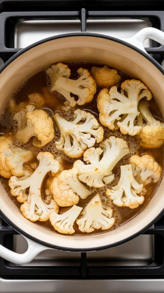 Add the roasted cauliflower and 3 cups vegetable broth to the pot. Bring to a simmer and cook for 5 minutes to blend the flavors.