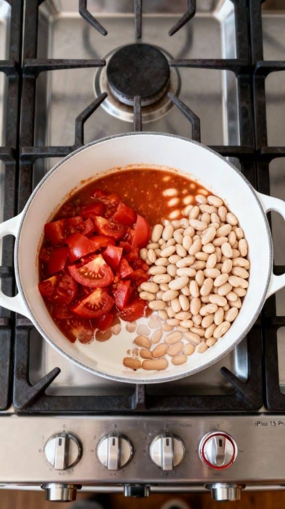 Pour in 1 can fire-roasted diced tomatoes, 2 cans of drained and rinsed white beans, 1 can of full-fat coconut milk, and 1½ cups vegetable broth. Stir everything together and bring to a simmer.