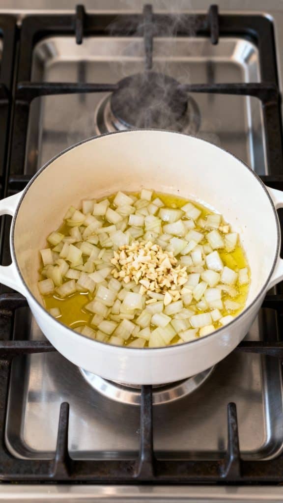 Heat 1 tablespoon olive oil in a large pot over medium heat. Add 1 diced yellow onion and 3 minced garlic cloves. Cook for 3–4 minutes until the onion is soft and translucent.