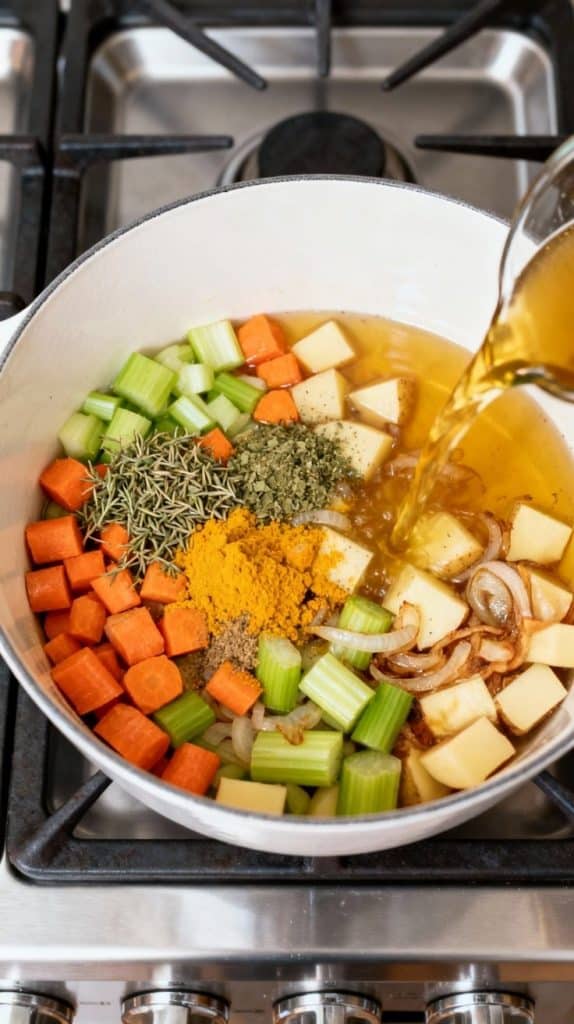 Sprinkle in 1 teaspoon dried thyme, 1 teaspoon dried oregano, and 1/2 teaspoon ground turmeric. Pour in 4 cups vegetable broth and stir. Bring to a boil.