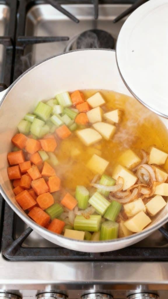 Add 2 diced carrots, 2 sliced celery stalks, and 2 peeled and diced potatoes to the pot. Stir and cook for 5 minutes.