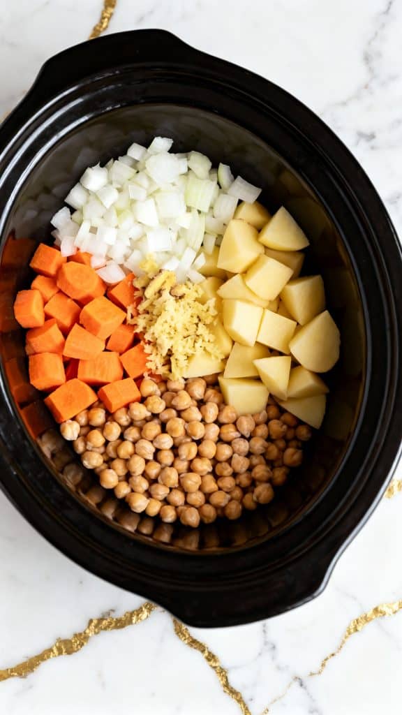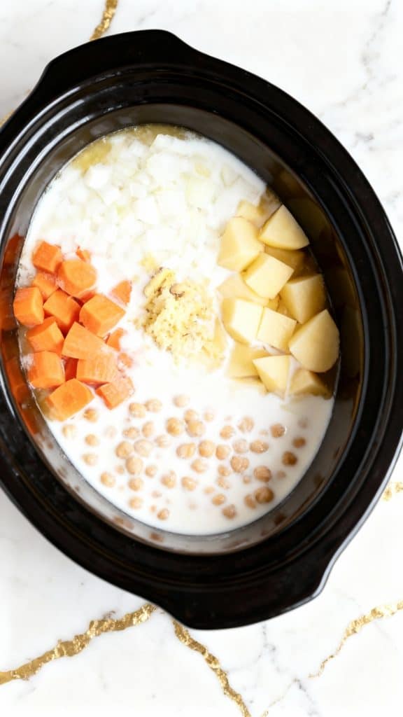Add 1 diced onion, 3 minced garlic cloves, 1 tbsp grated ginger, 2 diced russet potatoes, and 1 diced carrot into the crockpot.