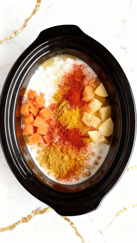 Add 2 tbsp curry powder, 1 tsp cumin, ½ tsp turmeric, ½ tsp paprika, 1 tsp salt, and ½ tsp black pepper to the crockpot.