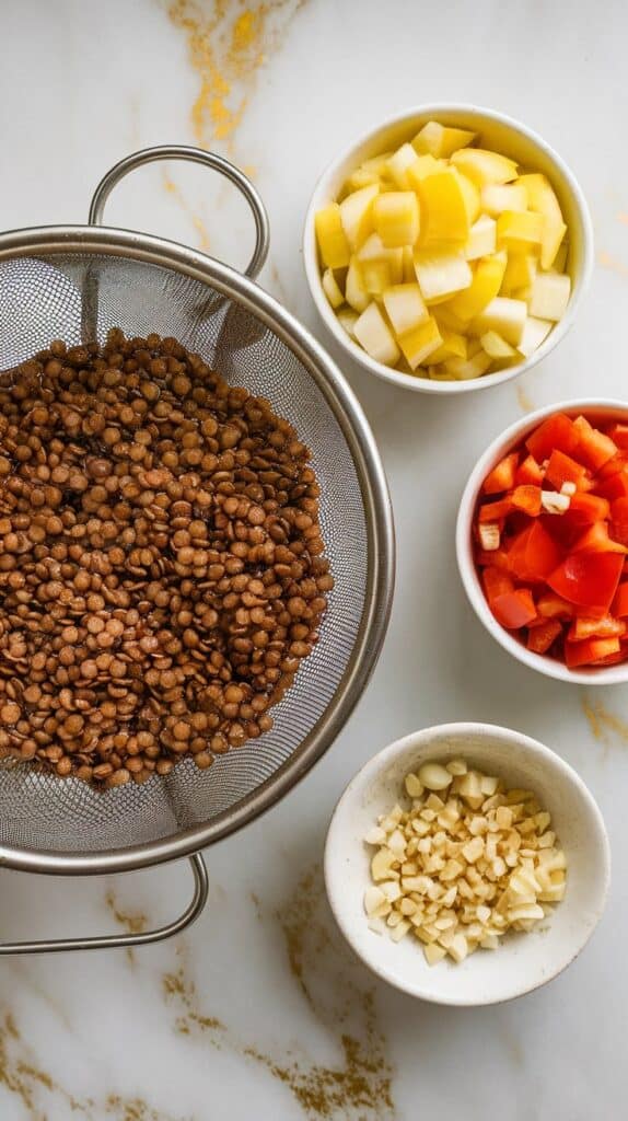 Rinse 1 ½ cups dried brown lentils under cool water using a fine mesh strainer. Finely dice 1 small yellow onion and 1 red bell pepper. Mince 3 cloves of garlic.