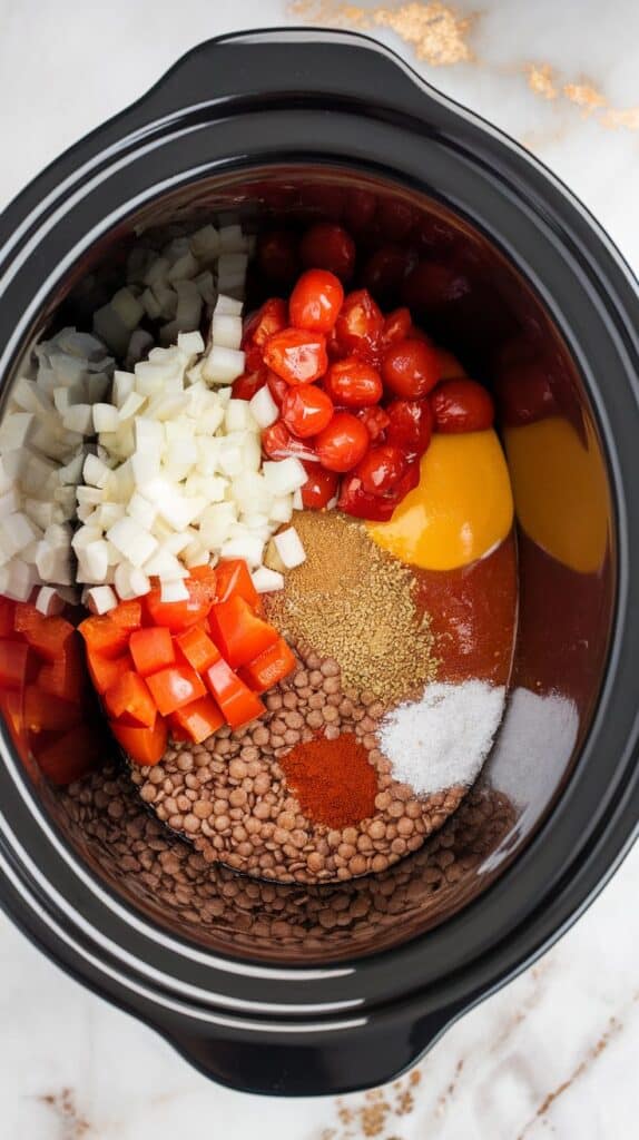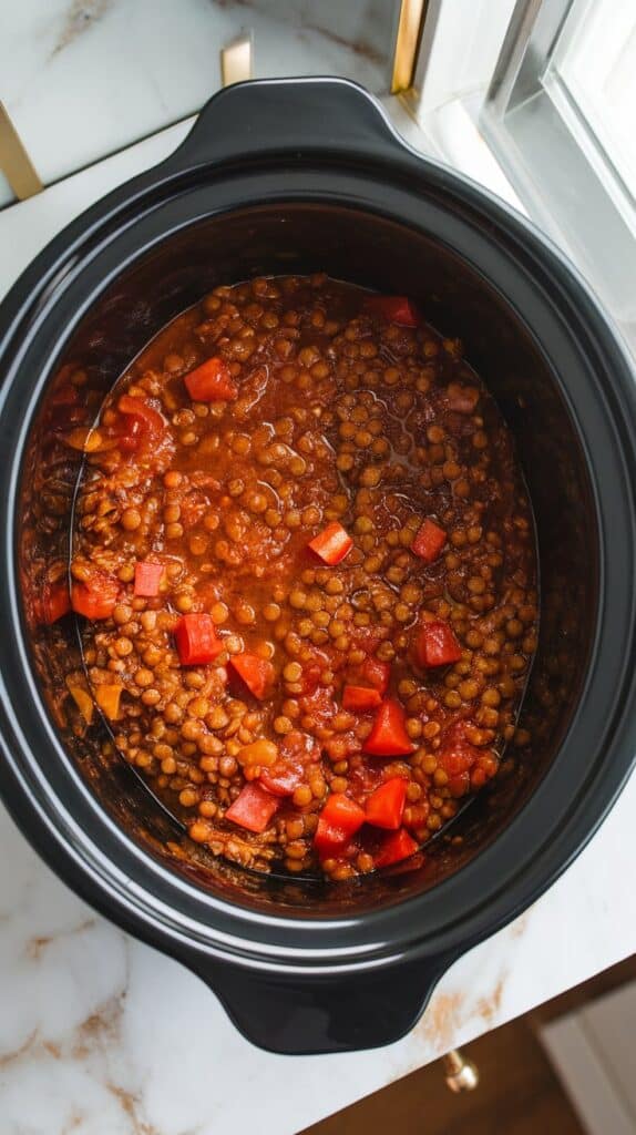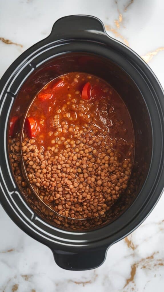 Into a 4 to 6 quart slow cooker, add the rinsed lentils, 1 small diced onion, 1 diced red bell pepper, 3 cloves minced garlic, 1 (15 oz) can fire-roasted diced tomatoes, 1 (8 oz) can tomato sauce, 2 tablespoons tomato paste, 2 tablespoons maple syrup, 1 tablespoon yellow mustard, 1 tablespoon apple cider vinegar, 1 teaspoon smoked paprika, 1 teaspoon chili powder, ½ teaspoon ground cumin, 1 teaspoon salt, ¼ teaspoon black pepper, and 3 cups vegetable broth. Stir well to combine.