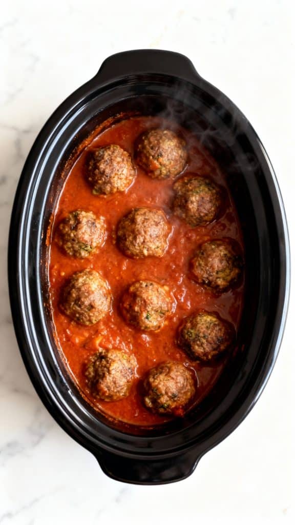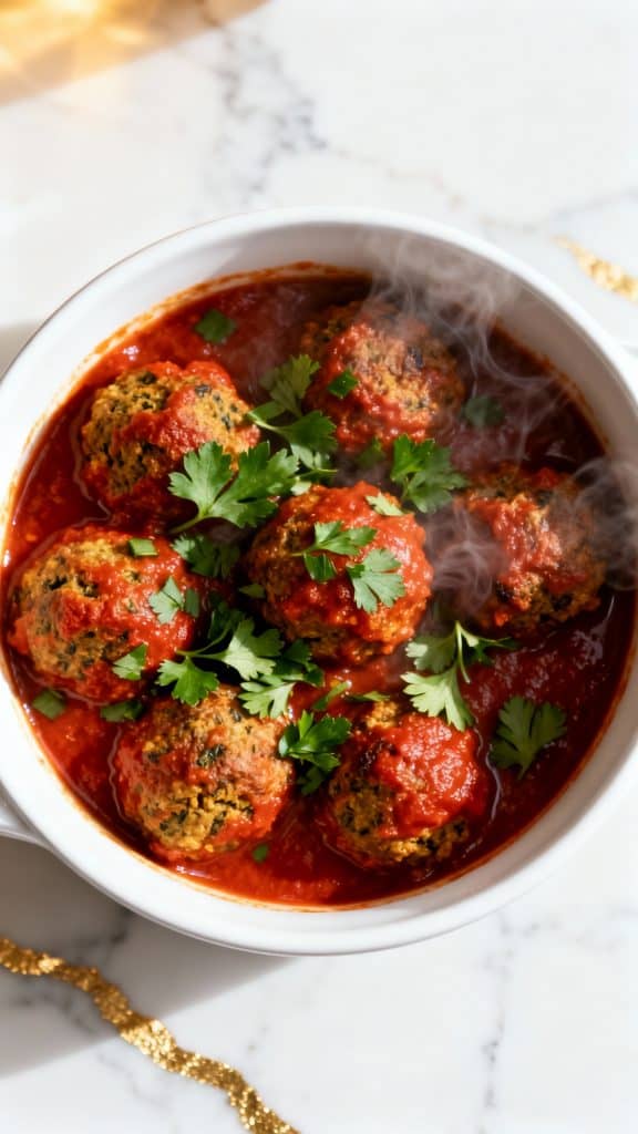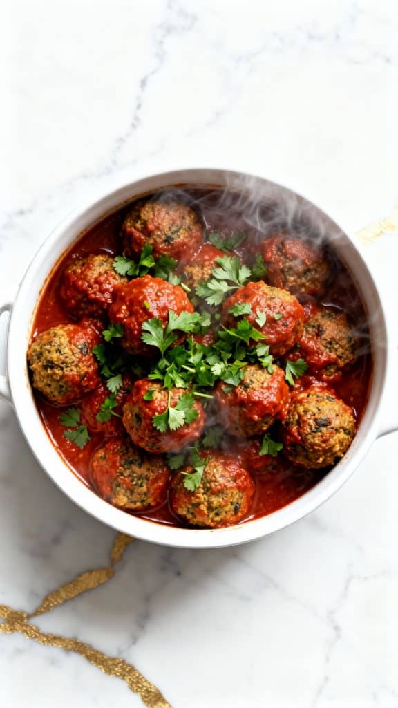 The oats and walnuts add just enough structure and fat to balance the softness of the lentils. Flaxseed acts as a binder, similar to an egg, holding everything together during the slow cooking process. The slow simmer in marinara allows the flavors to deepen without drying out the meatballs.