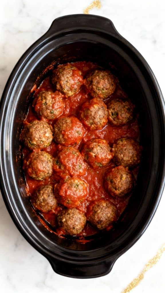 Pour half the marinara sauce into the bottom of the black oval crockpot. Gently place the meatballs inside, then pour the rest of the sauce on top.