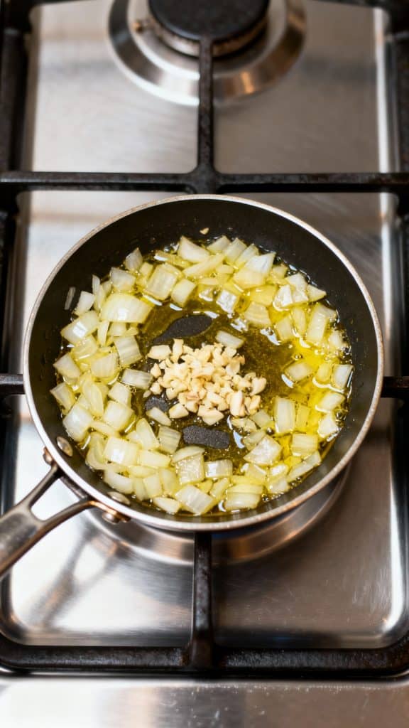 In a skillet, heat olive oil over medium heat. Add diced onion and sauté for 4–5 minutes until soft and translucent. Stir in the minced garlic and cook another 1–2 minutes until fragrant.