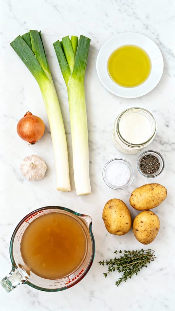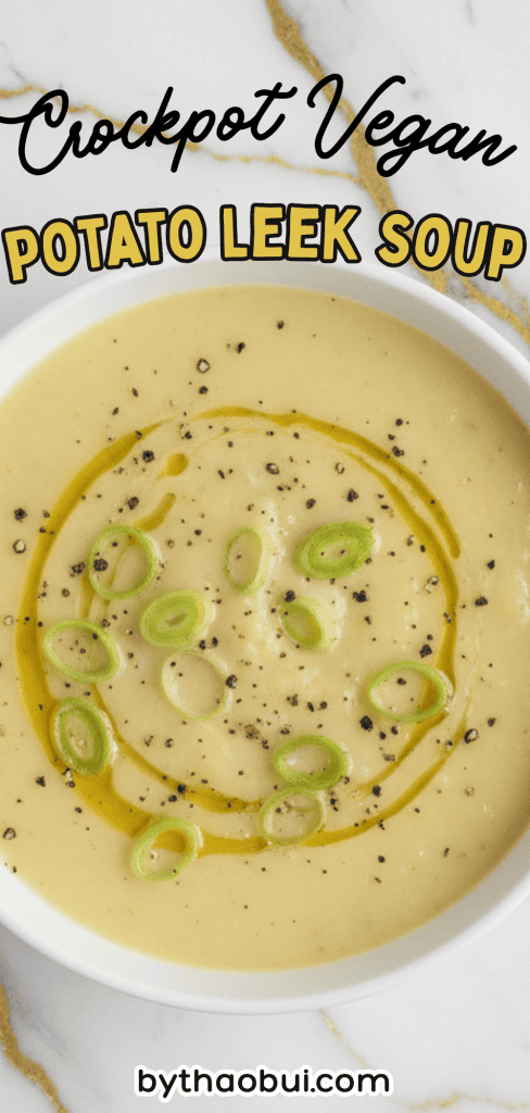 Blending cooked potatoes and leeks breaks down the starch, making the soup naturally creamy without needing dairy. Olive oil adds fat, which boosts mouthfeel and flavor. Leeks bring mild sweetness while broth and oat milk balance it all.