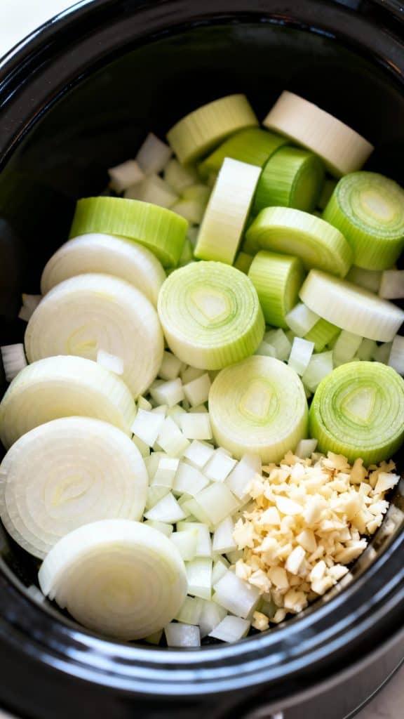 Step 1: Add sliced leeks, diced onion, and minced garlic to the crockpot