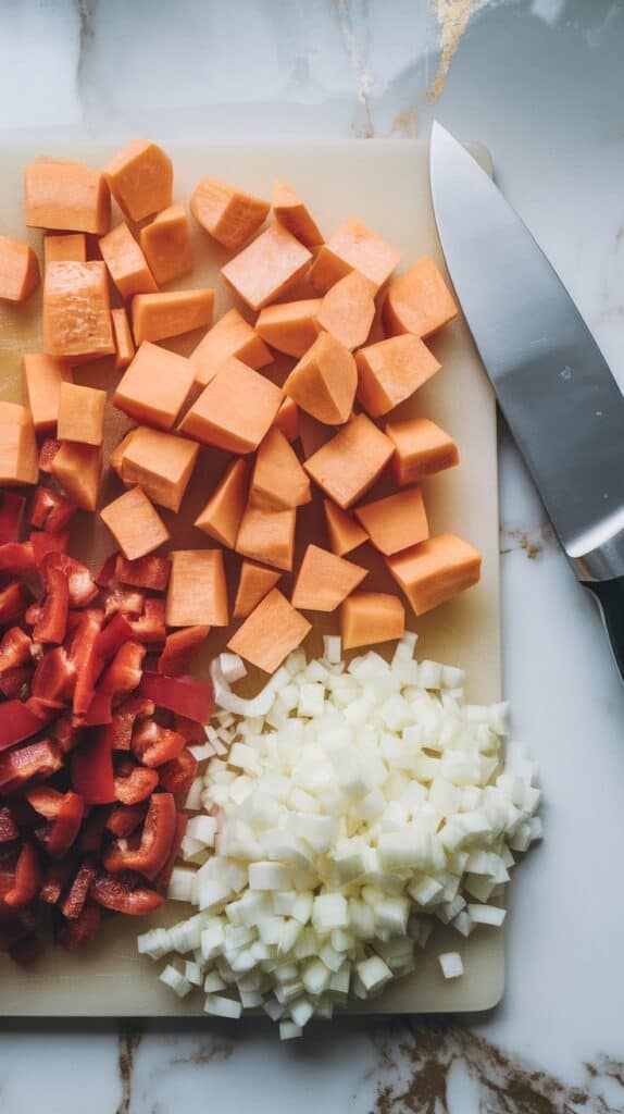 Peel and dice 2 medium sweet potatoes into ½-inch cubes. Dice 1 red bell pepper. Finely chop 1 small yellow onion and mince 3 cloves of garlic.