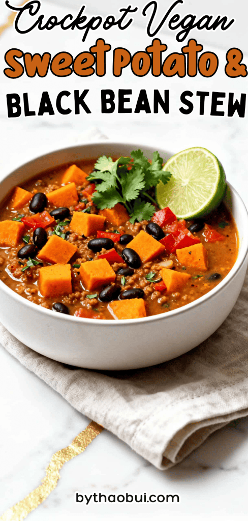 This cozy Crockpot Vegan Sweet Potato & Black Bean Stew is the kind of meal that makes your whole kitchen smell amazing, and you barely have to do anything.