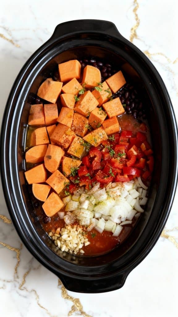 Add the following to your black oval crockpot: diced sweet potatoes, red bell pepper, onion, minced garlic, 1 drained can black beans, 1 can fire-roasted diced tomatoes (with juice), 1 ½ tsp cumin, 1 tsp smoked paprika, ½ tsp chili powder, ½ tsp salt, ¼ tsp black pepper, 1 tbsp olive oil, and 3 cups vegetable broth. Stir everything together.