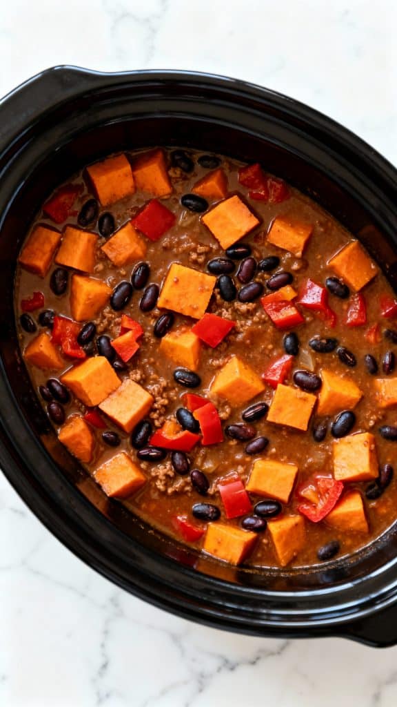 Sweet potatoes and black beans are both starchy and hold their shape well in slow cooking. Fire-roasted tomatoes add umami and acidity, which balance the natural sweetness of the sweet potatoes. Spices like cumin and smoked paprika bloom slowly in the heat, building a deep flavor without needing any meat or dairy.