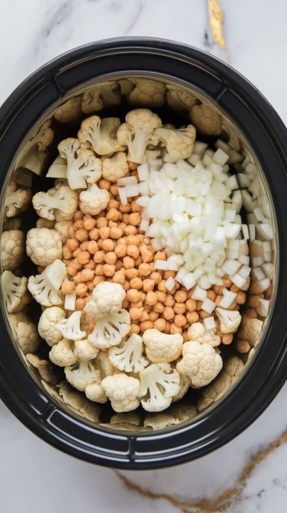 Add 5 cups of small cauliflower florets, 1 can of rinsed chickpeas, 1 finely diced small yellow onion, 3 minced garlic cloves, and 1 tablespoon grated ginger into the slow cooker.