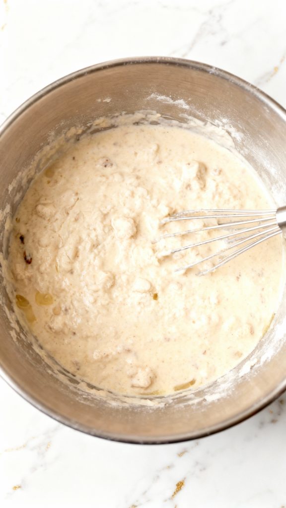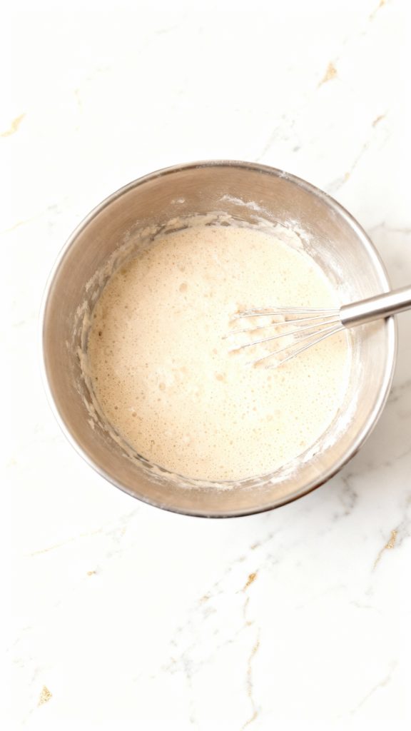 Pour in 1 cup unsweetened almond milk, 2 tbsp neutral oil, and 1 tsp vanilla extract. Whisk gently until just combined. The batter will be a little lumpy—don’t overmix.