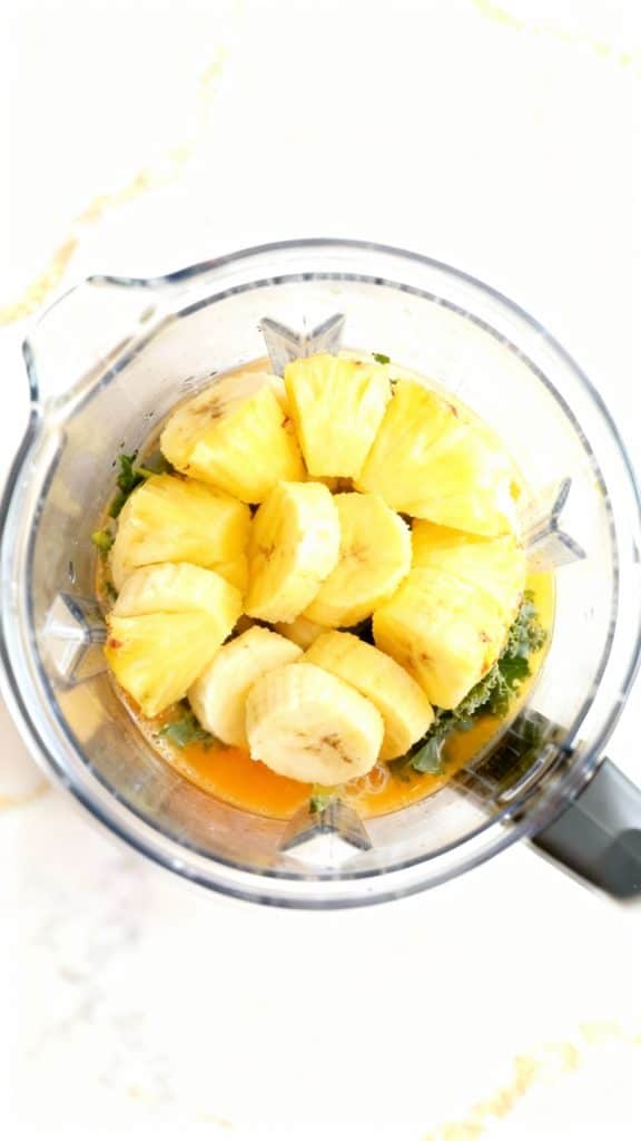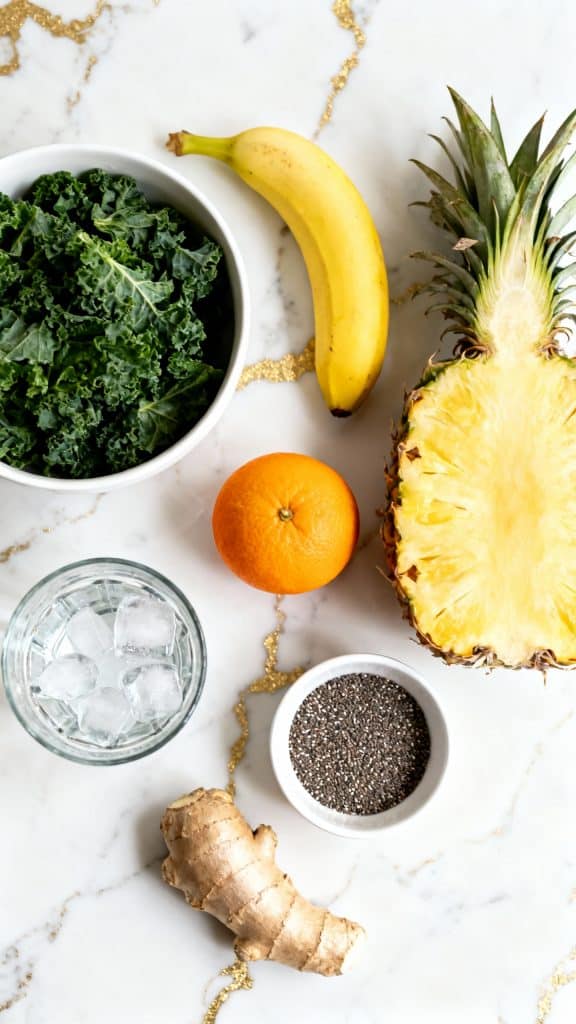 The acidity of the orange juice and pineapple cuts through the bitterness of kale, while the banana adds creaminess and natural sweetness. Frozen fruit acts like ice to chill and thicken without watering it down. The combination of fiber, vitamin C, and potassium gives your body a refreshing boost without a crash.