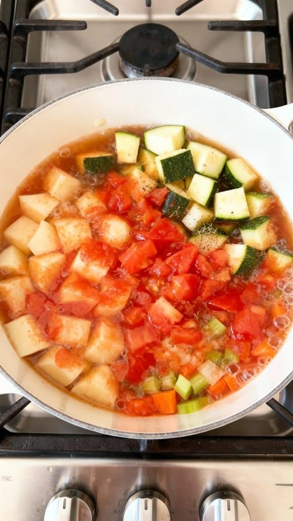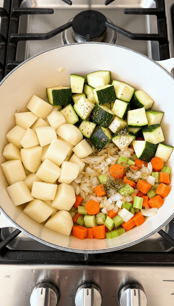Add 1 diced zucchini and 1 diced red potato. Stir in 1 tsp oregano, 1 tsp basil, ½ tsp thyme, ½ tsp crushed red pepper, salt, and pepper to taste. Cook for another 5 minutes to coat the veggies in the seasoning.