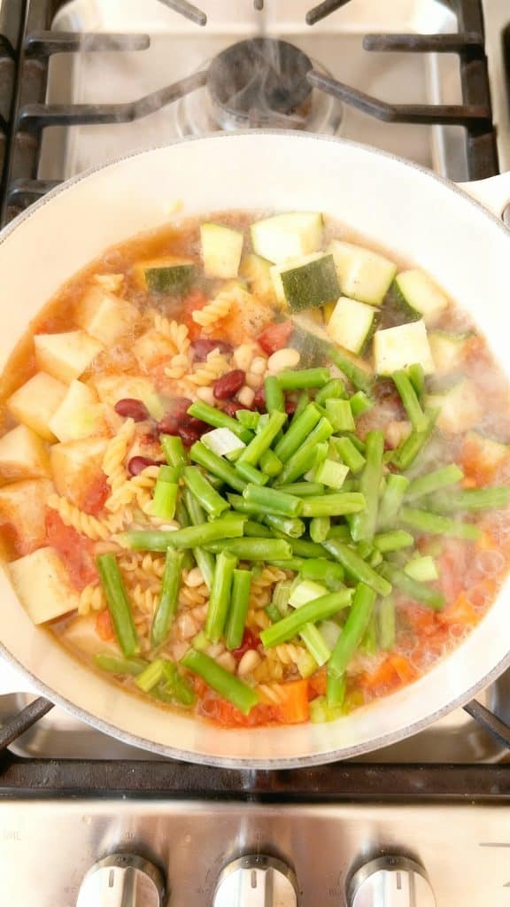 Add 1 cup small pasta and 1 cup chopped green beans. Simmer another 10 minutes, stirring occasionally, until pasta is cooked.