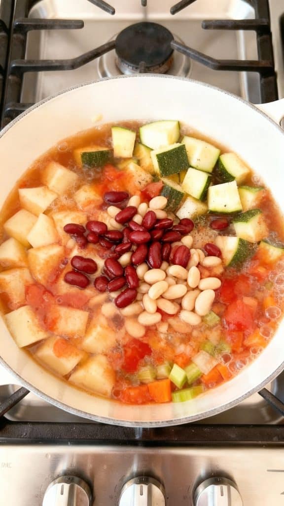 Add 1 can drained kidney beans and 1 can drained cannellini beans. Lower heat and let simmer for 15–20 minutes until veggies are tender.