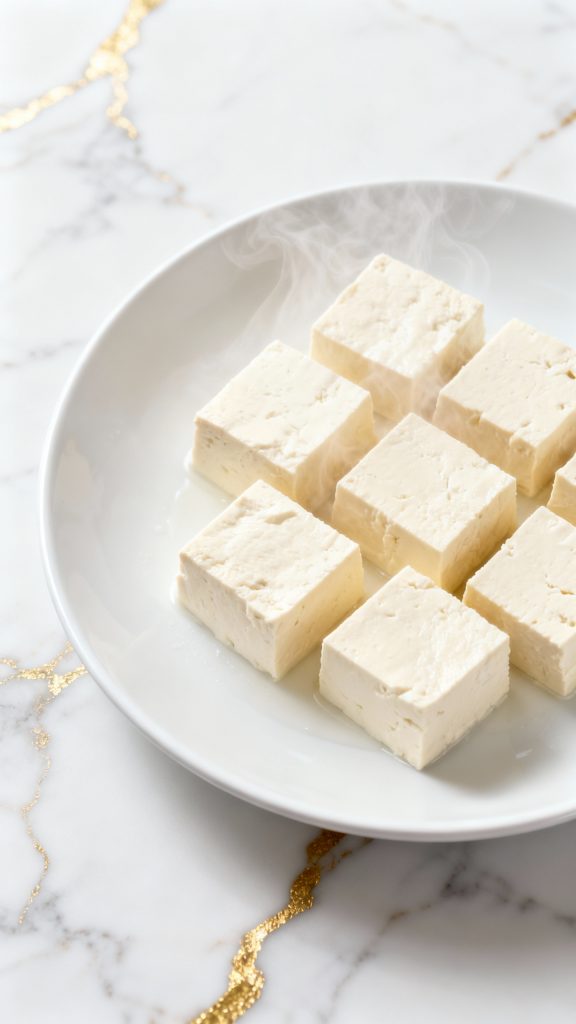 Place the tofu cubes on a microwave-safe plate. Microwave on low (50%) for 1 minute to warm slightly without breaking.