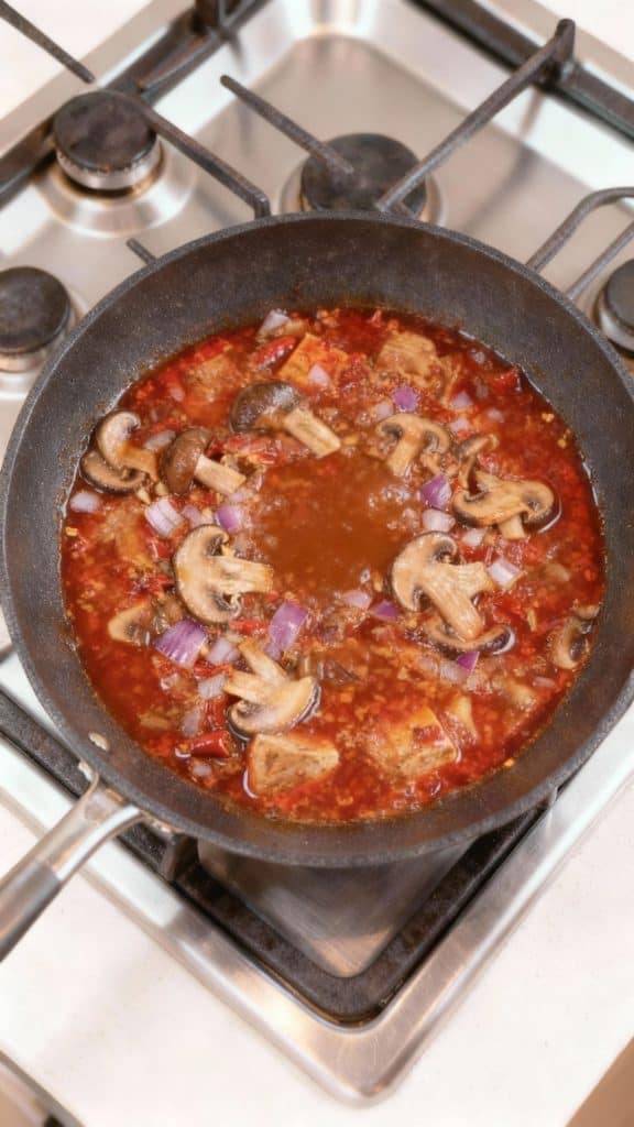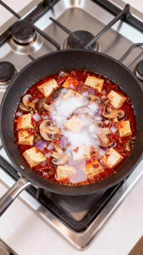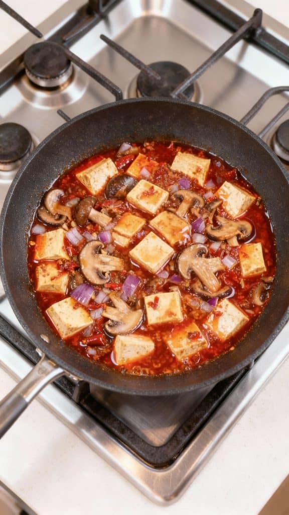 Doubanjiang is full of fermented umami flavor. When you fry it in oil with garlic and ginger, it “blooms” and releases more aroma. The cornstarch thickens the broth into a glossy sauce that clings to tofu and mushrooms perfectly. The mushrooms add deep savory notes that replace the meat in the traditional version.